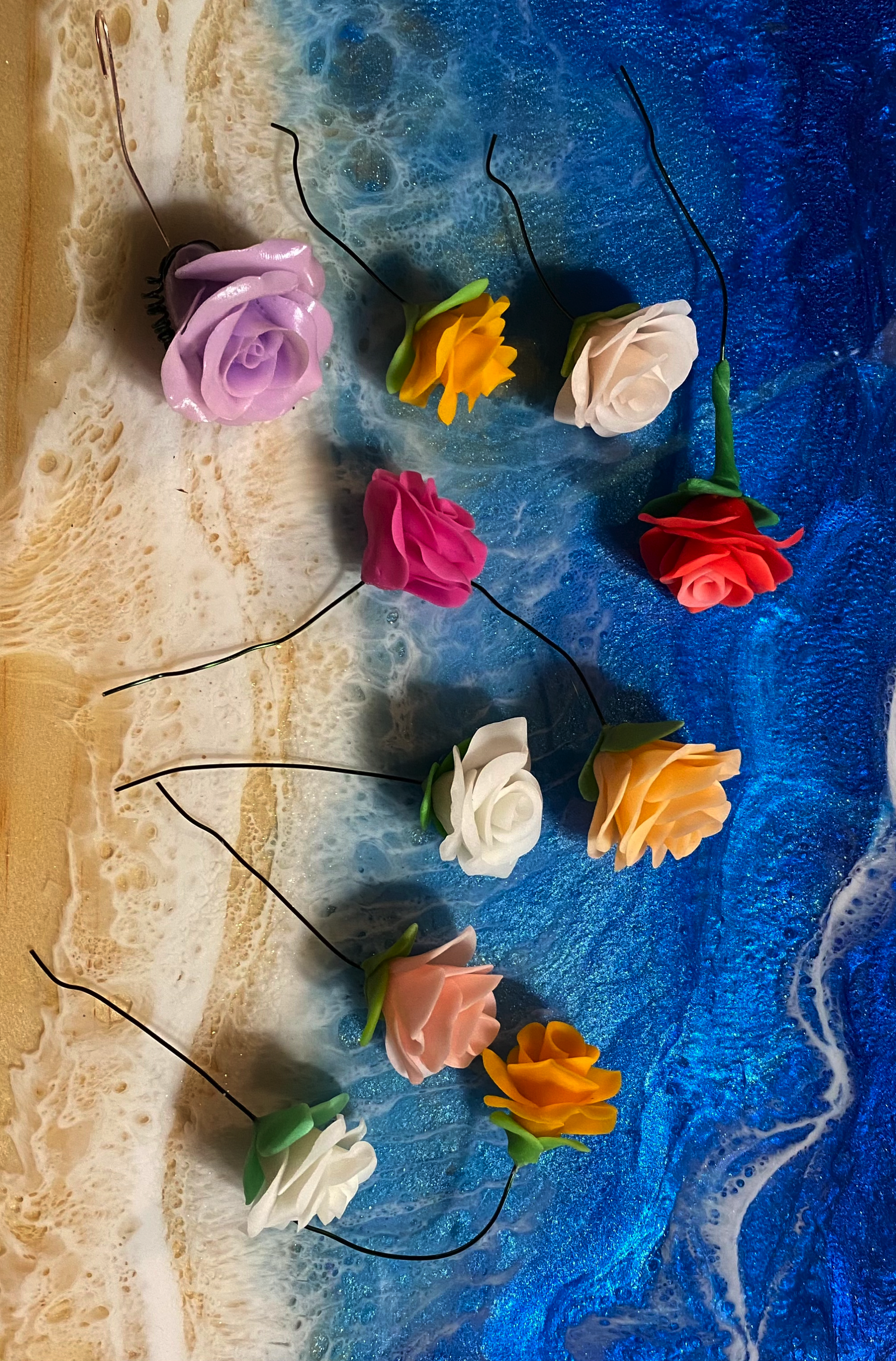 Making clay flowers and other items such a hops it so therapeutic. With minimal care, they will last a lifetime. The can also be embedded into resin designs like ring holders. For bridal party bouquets or corsages, boutonnieres for the groom, fathers and groomsmen, and corsages for the mothers. They make great delicate keepsakes for the entire wedding party.
